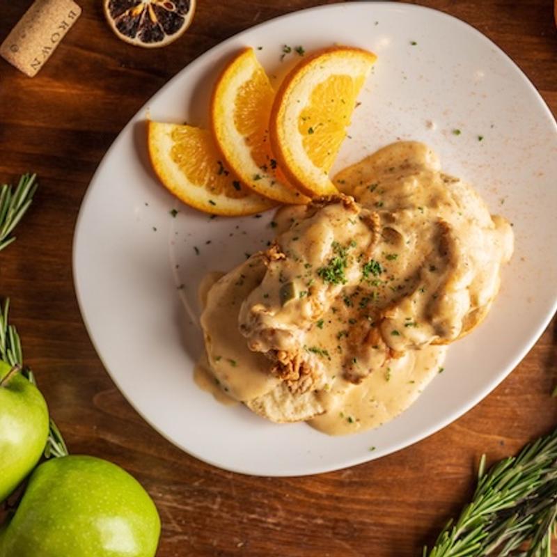 open faced biscuit, fried chicken, jalapeno bacon gravy
