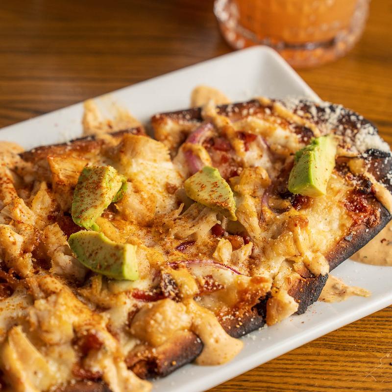parmesan romano, shredded mozzarella, grilled chicken, bacon, chipotle ranch, avocado, red onions, parmesan