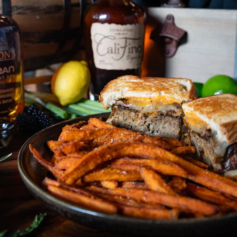 Twin smashed all beef patties, shredded cheddar, bacon, bbq sauce, arugula, fried onion straws