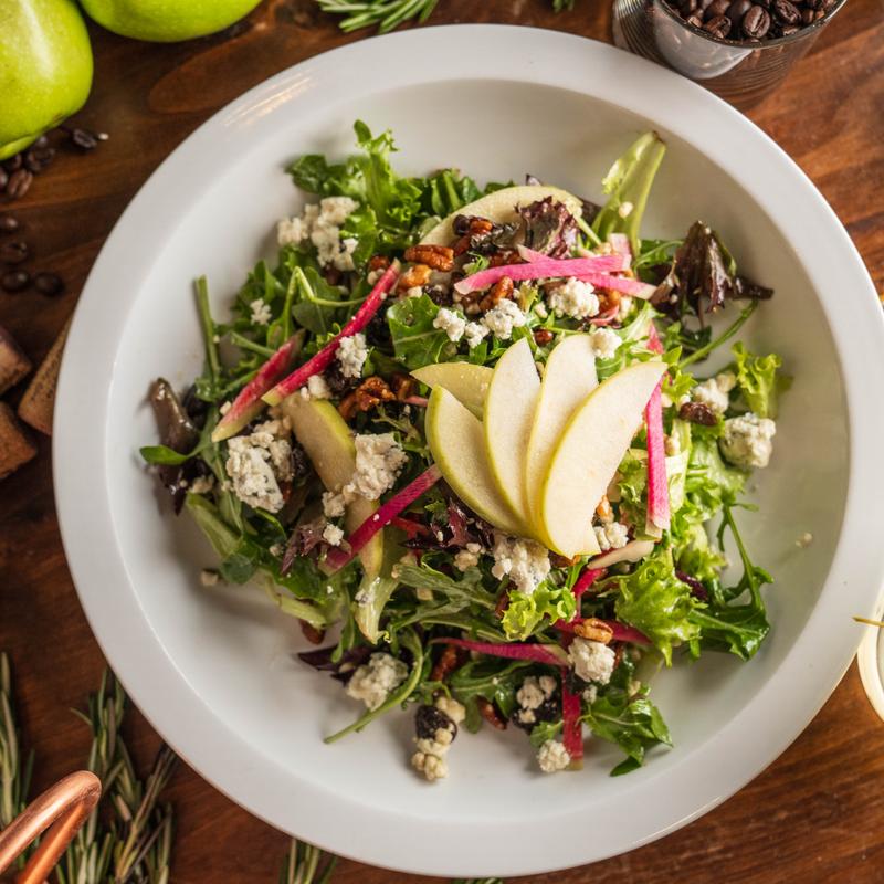 Apple, arugula, spring mix, raisins, watermelon radish, candied pecans, blue cheese crumbles, white balsamic vinaigrette