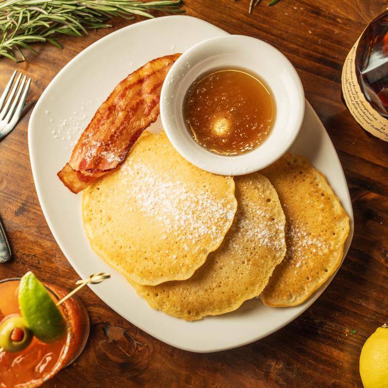 3 pancakes, butter, bourbon maple syrup, bacon or sausage add chocolate chips for $2