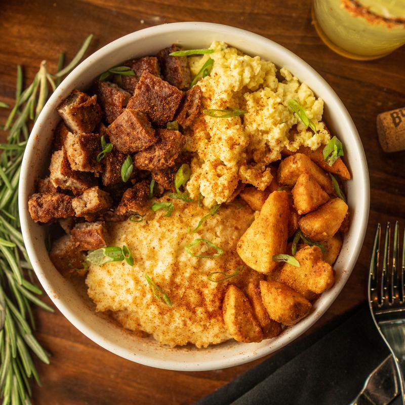 2 sausage patties, seasoned home fries, eggs, white cheddar grits